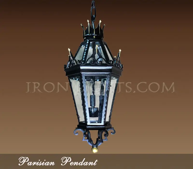 This medium-sized pendant features a warm antique copper finish, adding depth and authenticity to Mediterranean-style architecture. To personalize your fixture, explore our Finishing Touches section, where you can choose from an array of glass upgrades such as hand-rolled seedy glass, amber seedy, frosted or satin glass, and water glass. Multiple candelabra lamping options are also offered, all LED-compatible. Each lantern pendant includes 3 feet of handmade chain, canopy, and hardware, ensuring durability and a refined look. The Tuscany Lantern Pendant is more than just a light—it’s a statement piece that enhances the character of any outdoor setting.Iron Pendant Lights Spanish Aragon