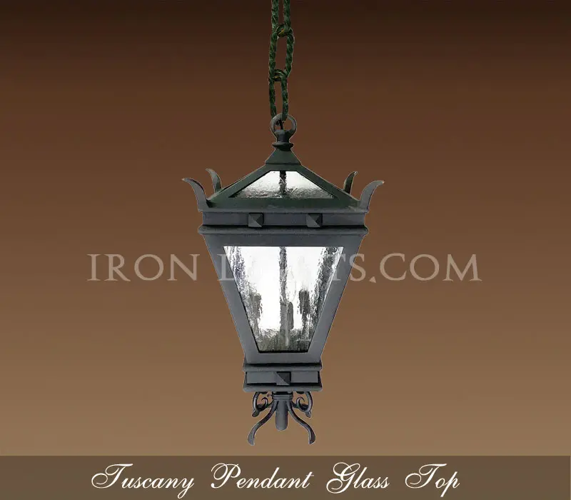 This medium-sized pendant features a warm antique copper finish, adding depth and authenticity to Mediterranean-style architecture. To personalize your fixture, explore our Finishing Touches section, where you can choose from an array of glass upgrades such as hand-rolled seedy glass, amber seedy, frosted or satin glass, and water glass. Multiple candelabra lamping options are also offered, all LED-compatible. Each lantern pendant includes 3 feet of handmade chain, canopy, and hardware, ensuring durability and a refined look. The Tuscany Lantern Pendant is more than just a light—it’s a statement piece that enhances the character of any outdoor setting.Iron Pendant Lights Spanish Aragon