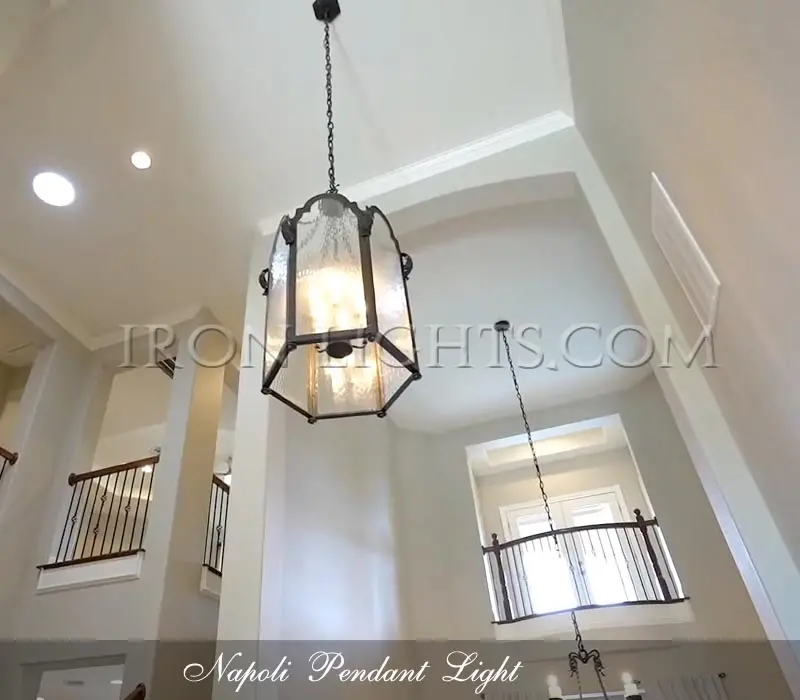 Wrought iron lighting for high ceilings foyer begins with the Napoli Mediterranean-Style Pendant Light Fixture, a design that blends Old World elegance with refined, artisan craftsmanship. Offered in three distinct sizes, the Napoli is well-suited for a variety of interior spaces, like your entry foyer. Shown here in the medium size, it features a rich aged metal finish paired with upgraded water glass, creating a warm, textured glow that enhances its classic Mediterranean appeal. The small and medium fixtures include four candelabra sockets; the large fixture includes 6-candelabra sockets set up in two tiers, all fully compatible with LED light bulbs for efficient, long-lasting illumination.